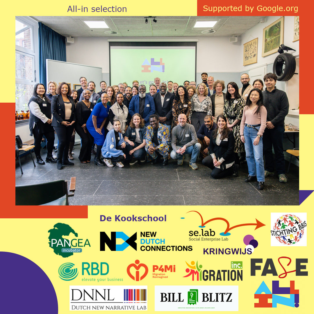 De projecten die zijn gekozen om financiële ondersteuning te ontvangen vanuit het All-in programma zijn Platform for Migration and Integration (P4Mi), Coöperatie Social Enterprise Lab U.A., Pangea Incubator, Stichting Bevordering Beeldvorming Internationale Samenleving (BBIS), Bill Blitz, De Kookschool, New Dutch Connections, Financing Agency for Social Entrepreneurship (FASE), Stichting Dutch New Narrative Lab Foundation en Kringwijs. Hun activiteiten om gelijke kansen te creëren voor sociaal ondernemers met een migratieachtergrond zijn beoordeeld op impact, innovatie, probleem/oplossingsfit, inclusie en organisatie. Kijk voor meer informatie over de voorwaarden en het aanvraag- en selectieproces op onze website.