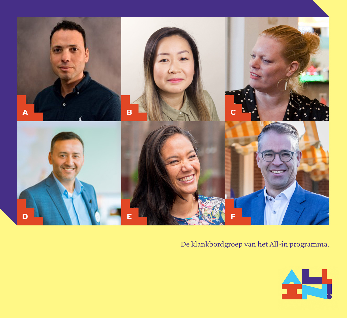 De klankbordgroep bestaat uit (A) Mohammed Azzouz (Pharos), (B) Diem Do (CodeGorilla), (C) Fleur Bakker (Refugee Company), (D) Rachid el Ousrouti (Rotterdam Vakmanstad), (E) Maaike Irizarri van Suchtelen (Fawaka Ondernemersschool) en (F) André Dolsma (Qredits).